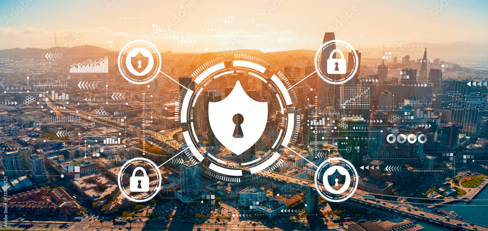 Cyber security theme with downtown San Francisco skyline buildings