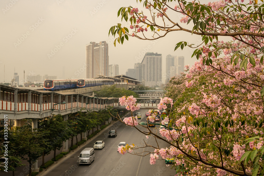 Bangkok, Thailand-February 7, 2020: Pink Trumpet tree flower know plant begin blooming at Chatuchak park Phaholyothin road, beside Bts train station under cloudy sky with PM 2.5 air pollution