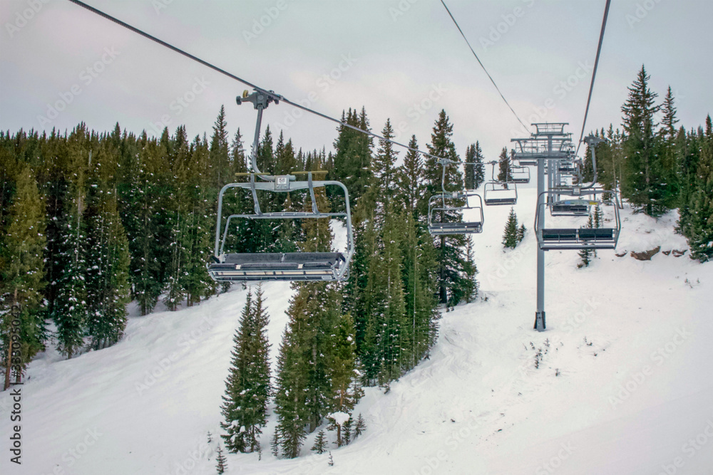 Ski lift at resort in Vail Colorado surrounded by green trees