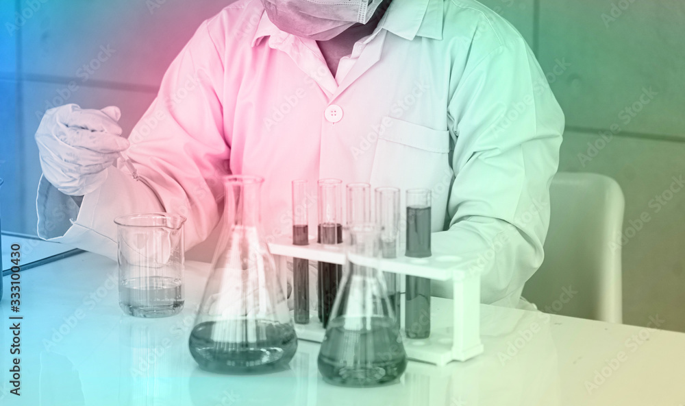 Asian Scientist Pipetting at a Biomedical Laboratory.Focused young life science professional pipetting solution into the glass cuvette.