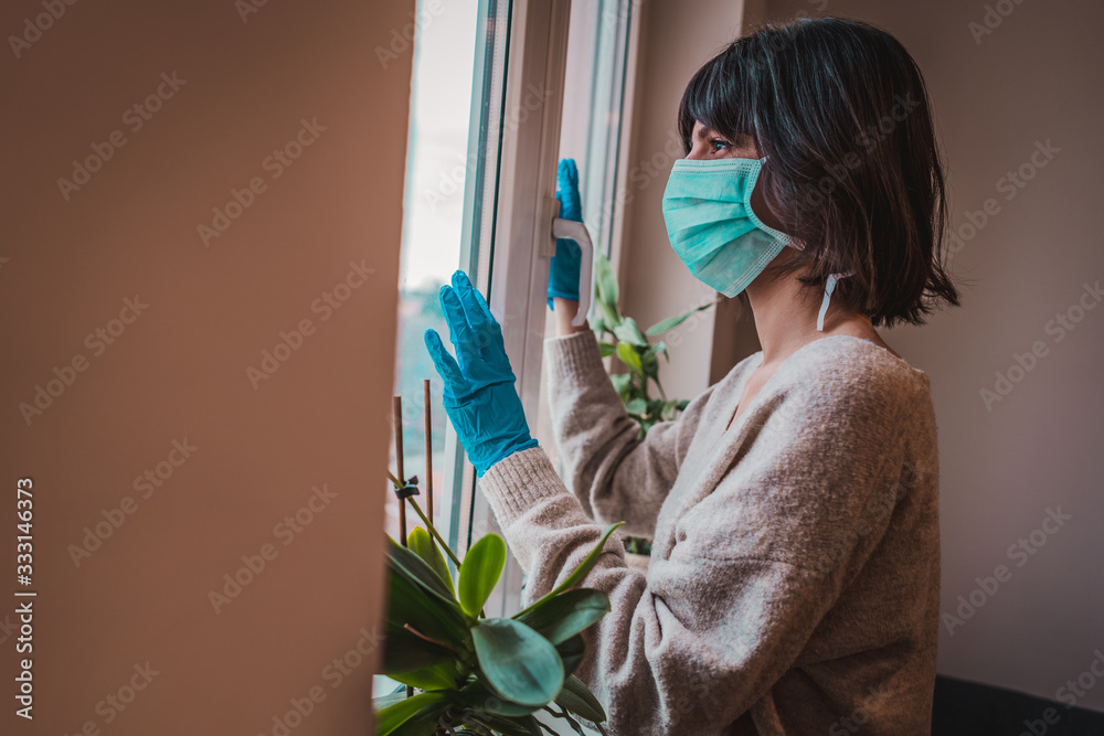 Young woman in medical mask and gloves isolation at home for self quarantine. Stay at ome quarantine, prevention COVID-19. Coronavirus outbreak situation
