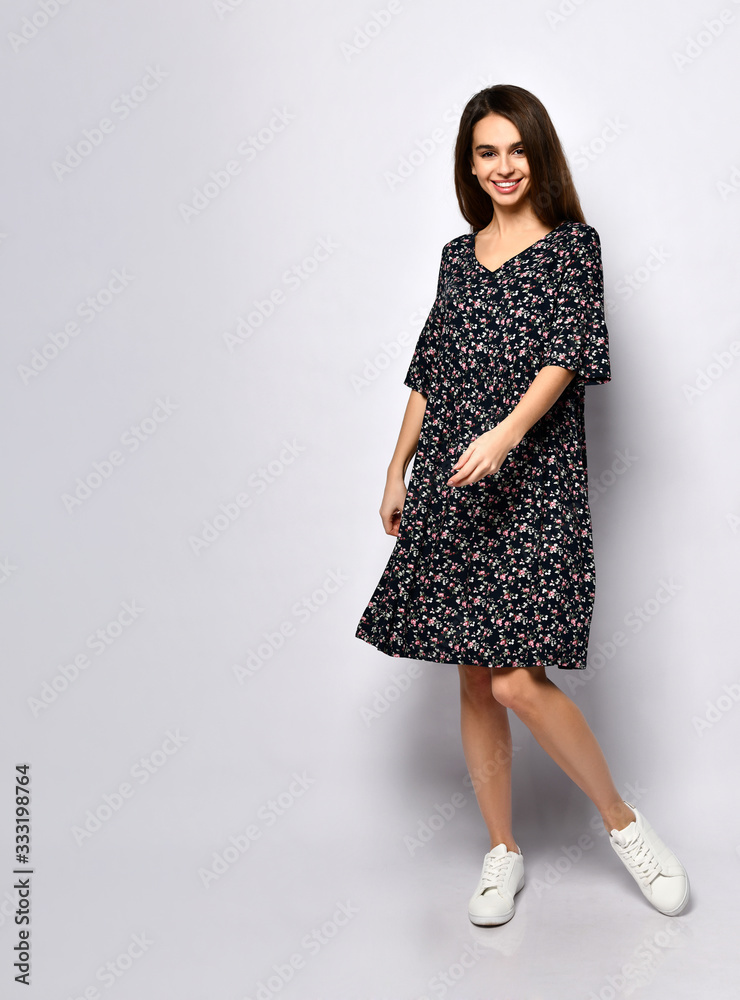 Gorgeous brunette woman in black dress with floral print and white sneakers. She smiling, posing isolated on white. Full length