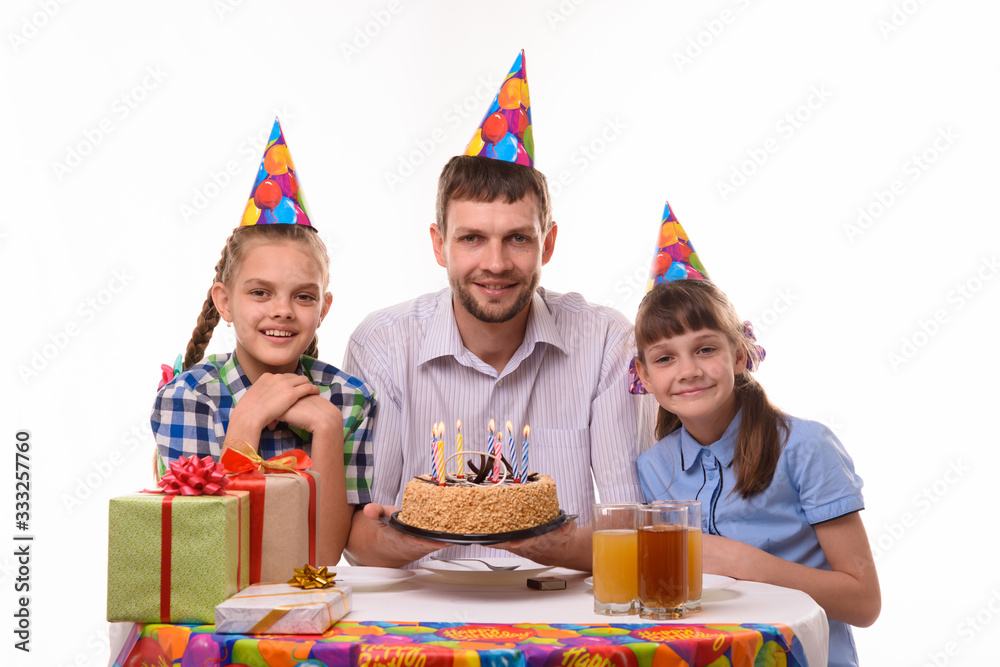 Dad and two daughters with a holiday cake at the table happily look at the frame