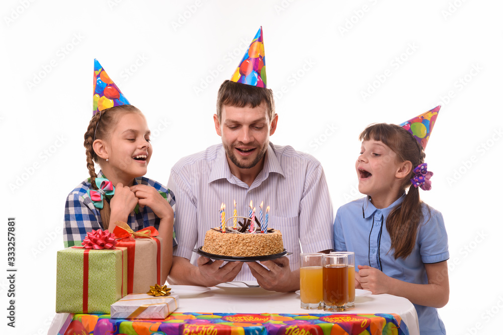 Dad and two daughters took a little more air to blow out the candles on the holiday cake