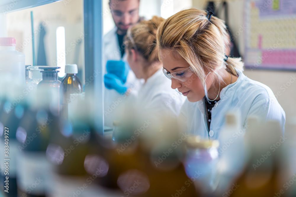 Beautiful young woman scientist in laboratory working. Young female scientist doing some research.