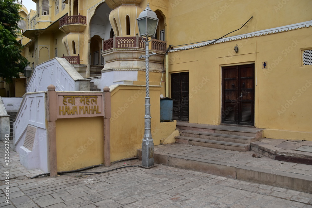 インドのラジャスタン州のジャイプル ハワ・マハルと呼ばれる、 風の宮殿の入場口と案内看板