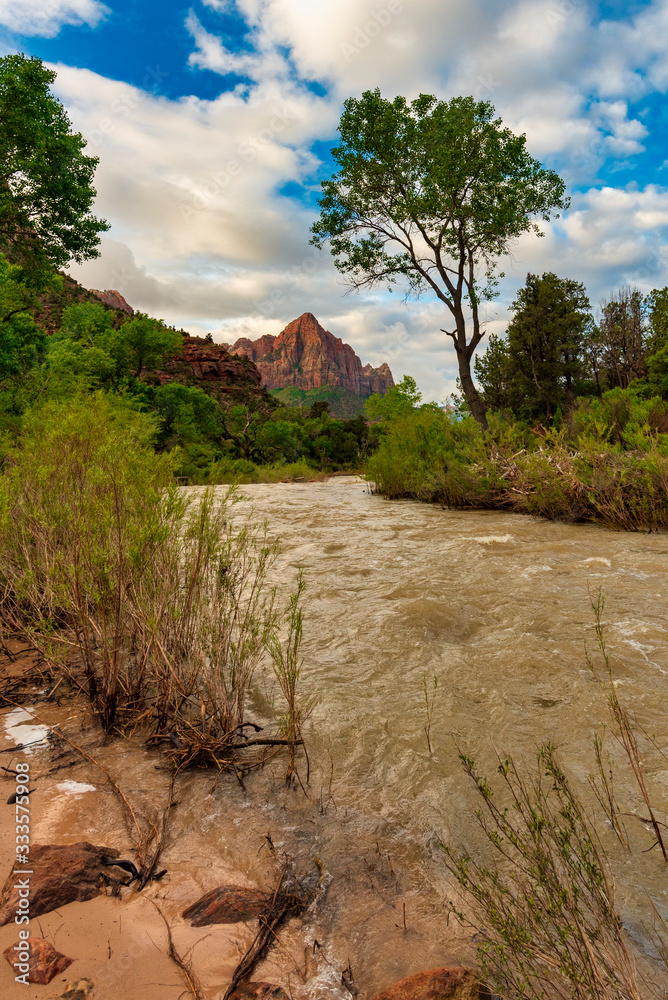 The Watchman mountain viewed from the Virgin River in Zion National Park, Utah.