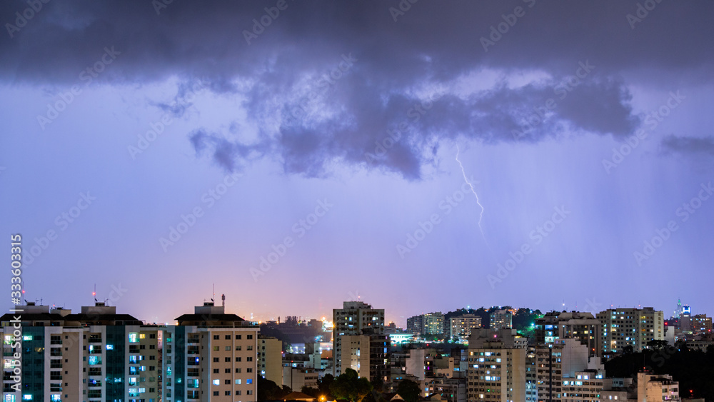 Imagens da chegada de uma tempestade com raios e chuva, na cidade durante a noite em Niterói, Rio de Janeiro, Brasil