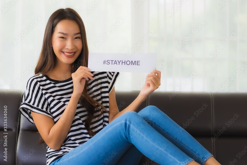 Portrait beautiful young show paper stay home on sofa in livingroom for save people from coronavirus