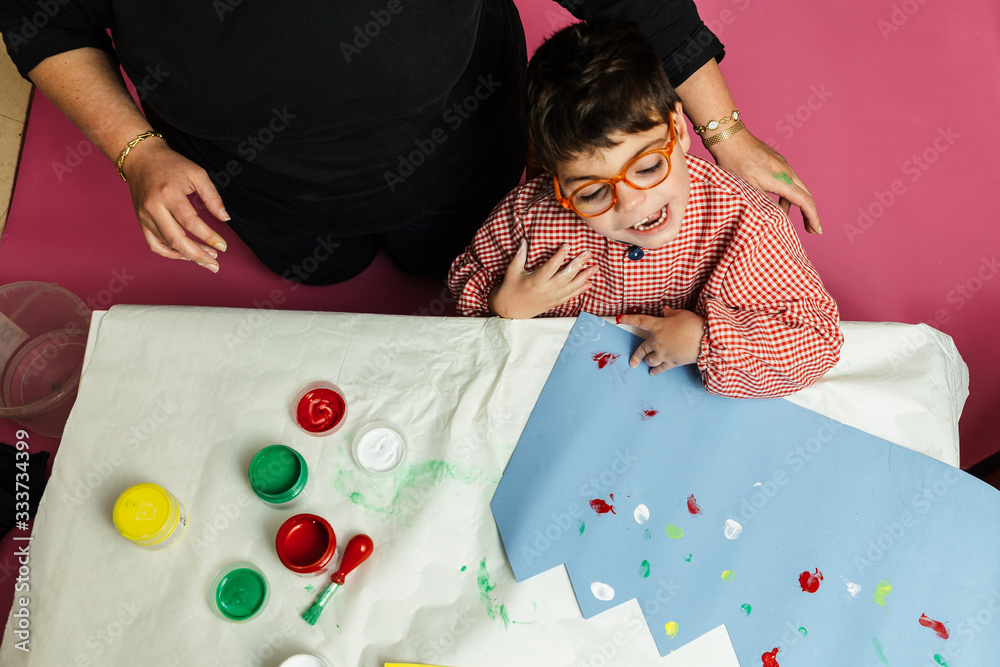 profesora educación especial y alumno con bata están pintando con las manos una corona de cumpleaños y una cartulina amarilla con pinturas acrilicas sobre la mesa. terapia de manualidades plásticas.