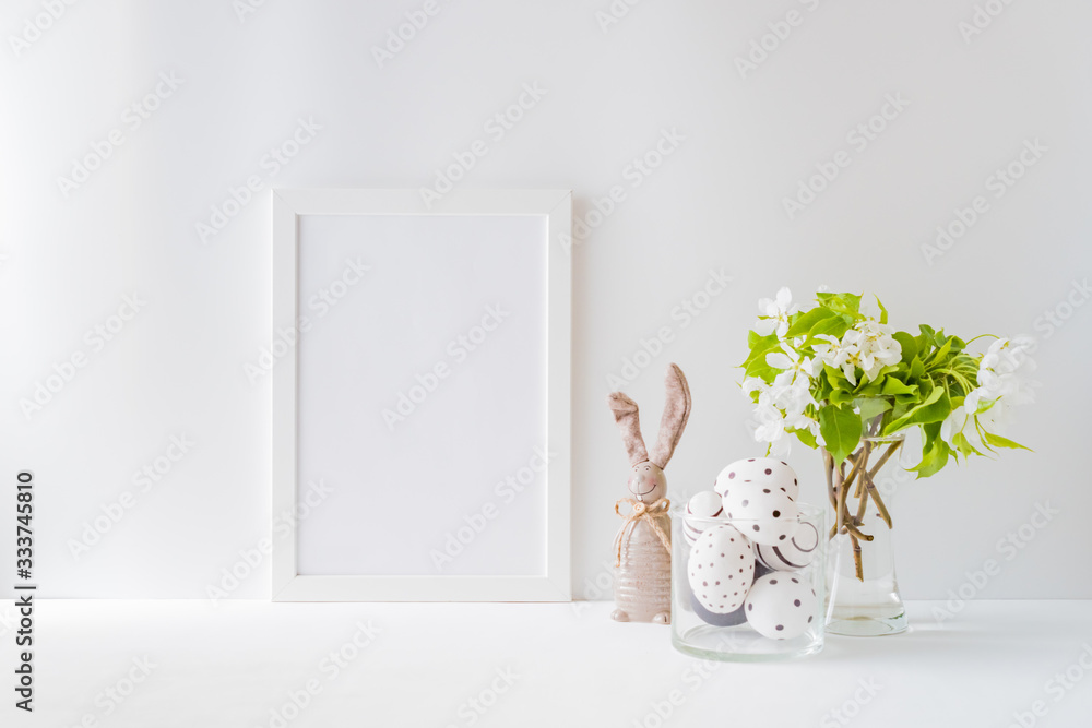Home interior with easter decor. Mockup with a white frame and spring flowers in a vases on a light background