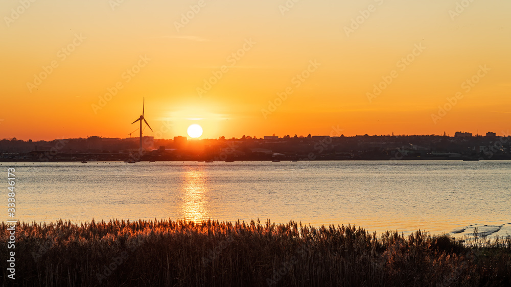 Sun setting over Slade Green near dartford along the Thames Estuary, Kent England