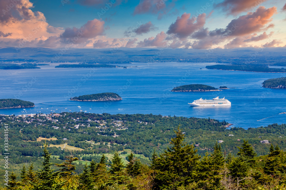 A luxury cruise ship docked in the ocean off the coast of Maine shot from evergreen covered hills