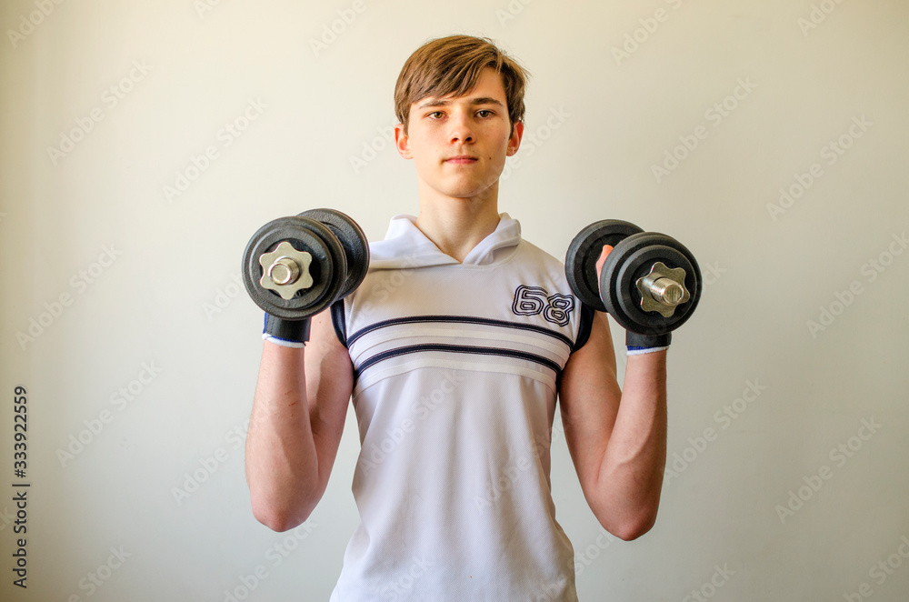 Teenager boy in a white T-shirt is training with two dumbbells.