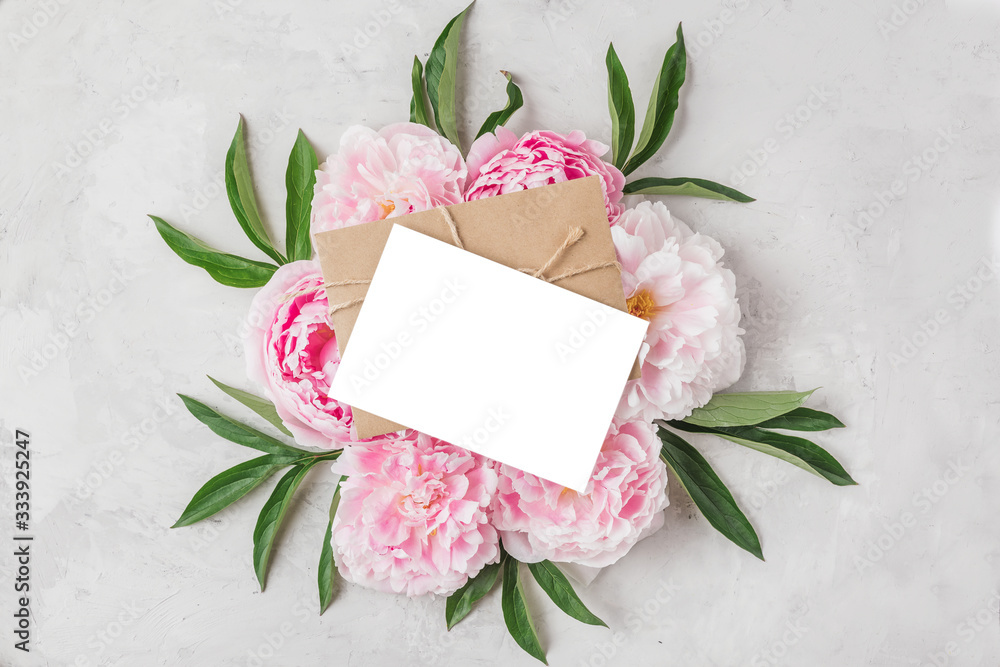 Blank greeting card with pink peony flowers on concrete background. Wedding invitation. Flat lay. Mock up