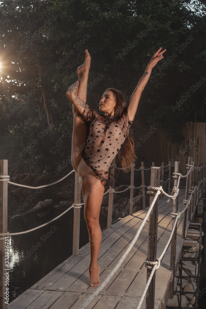 Beautiful acrobat woman posing on the ropes of the small wooden bridge during summer day