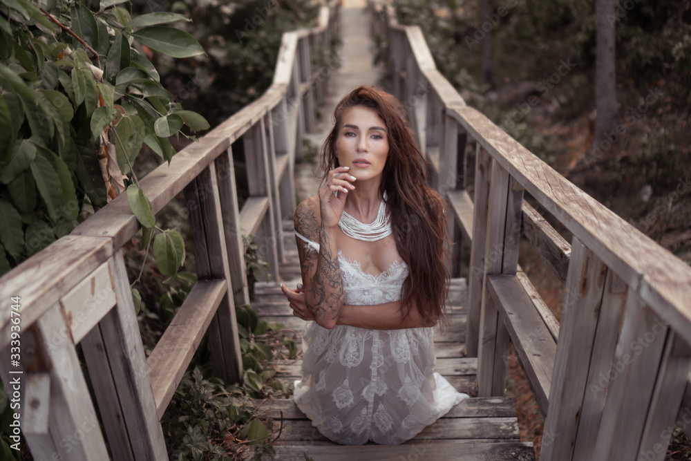 Romantic portrait of beautiful brunette woman in white lace dress on the wooden staircase in the forest