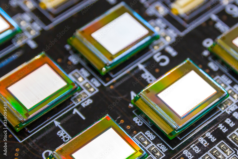 Several microdisplays bright of white color on the test station. Monitors glow brightly of white color close up.Rainbow on surface.