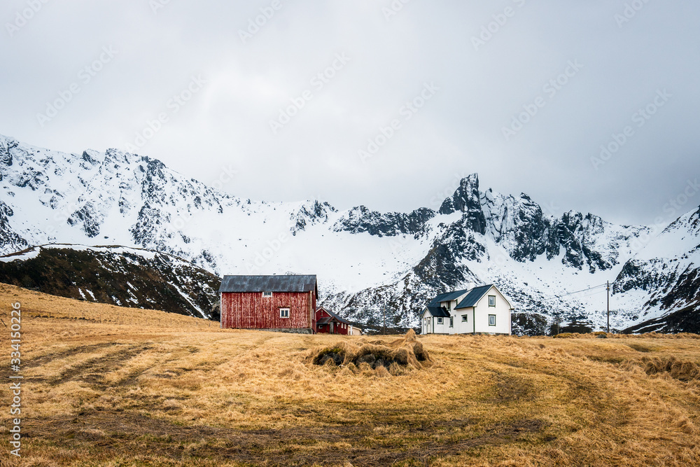 Old barnhouse and farm buildings with snow covered mountains in the background in Lofoten, Norway.
