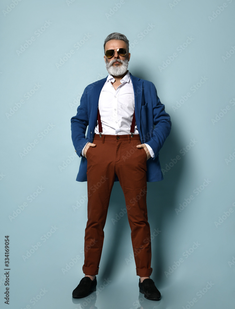 Senior man in white shirt, jacket, brown pants, black loafers. Straightening sunglasses, hand in pocket, posing on blue background