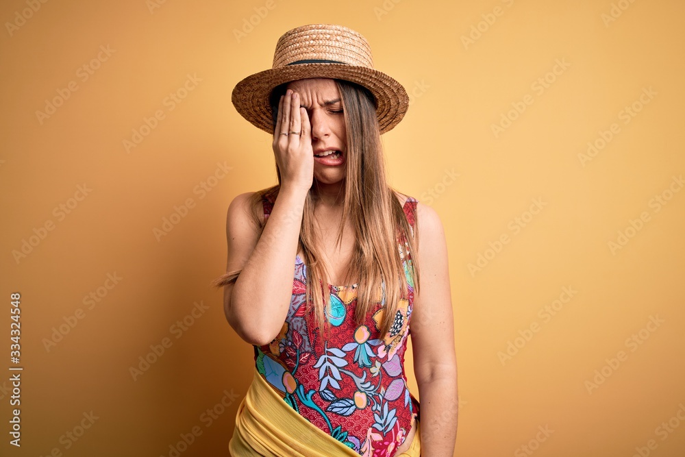 Young beautiful blonde woman wearing swimsuit and summer hat over yellow background Yawning tired covering half face, eye and mouth with hand. Face hurts in pain.
