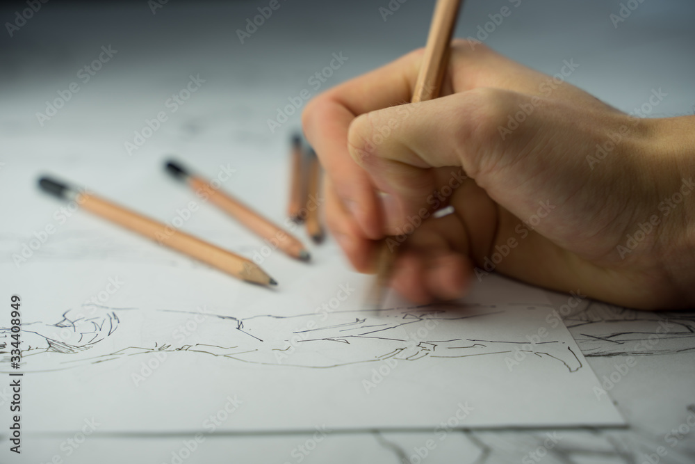 A top view flat lay of many figure drawing pencil and marker sketches. The artist worskspace with male and female drawings and pencils on the white paper, art, craft, creativity, inspiration, concepts