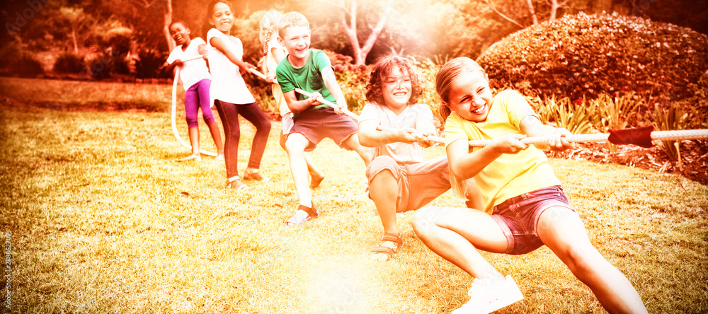 Two brothers sibling boy in casual clothes on playground climbing rope and athletic rings. Kids has a lot of fun. Healthy leisure time with children. Family competition friendship concept