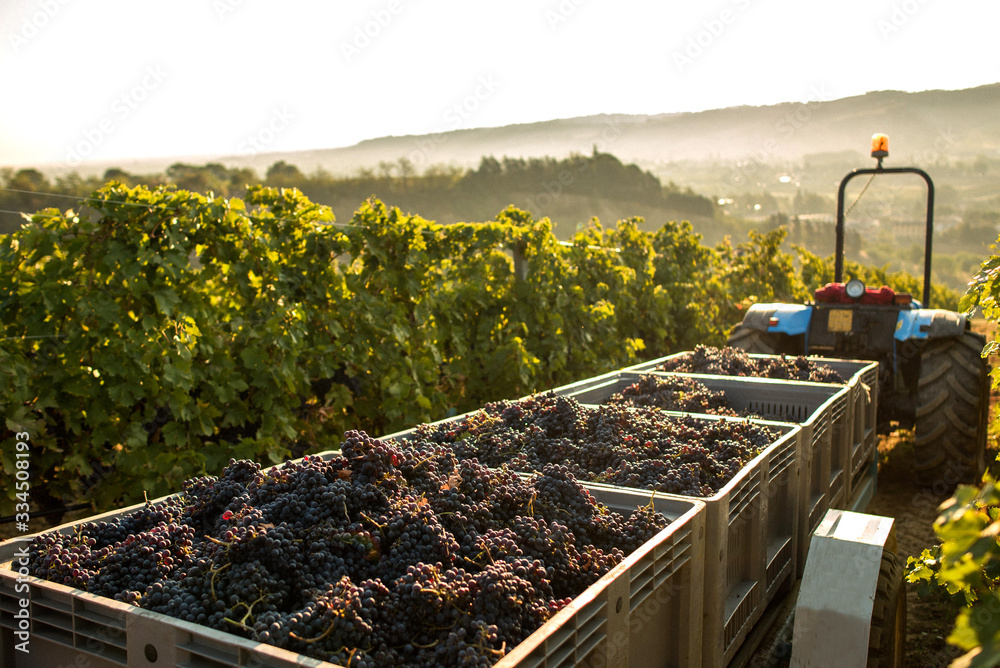 tractor with its agricultural trailer full of ripe red grape during harvest in the row of a vineyard during sunset