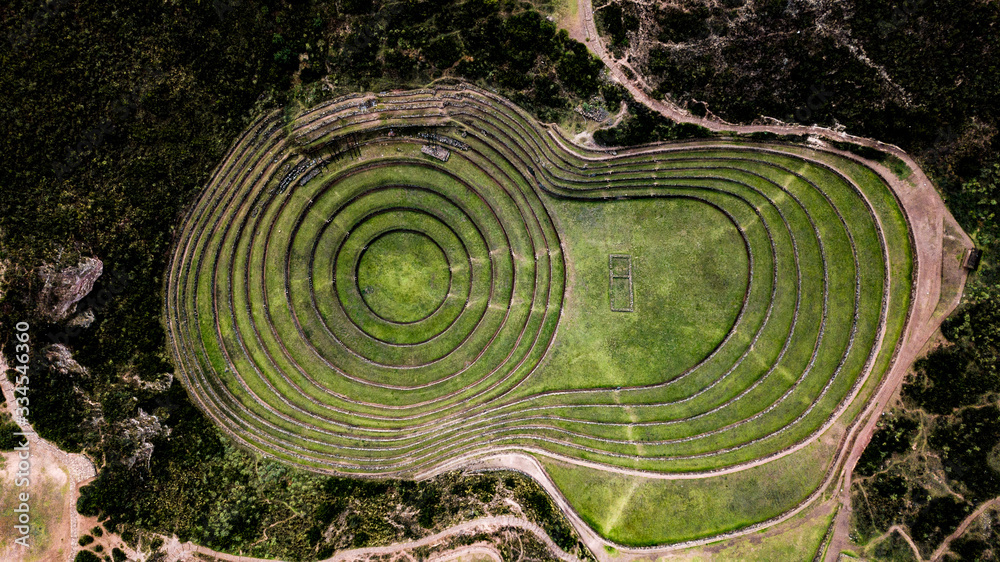 Aerial view of Moray Archeological site - Inca ruins of several terraced circular depressions, in Maras, Cusco province, Peru. Top tourist attraction in Sacred valley of the Incas.