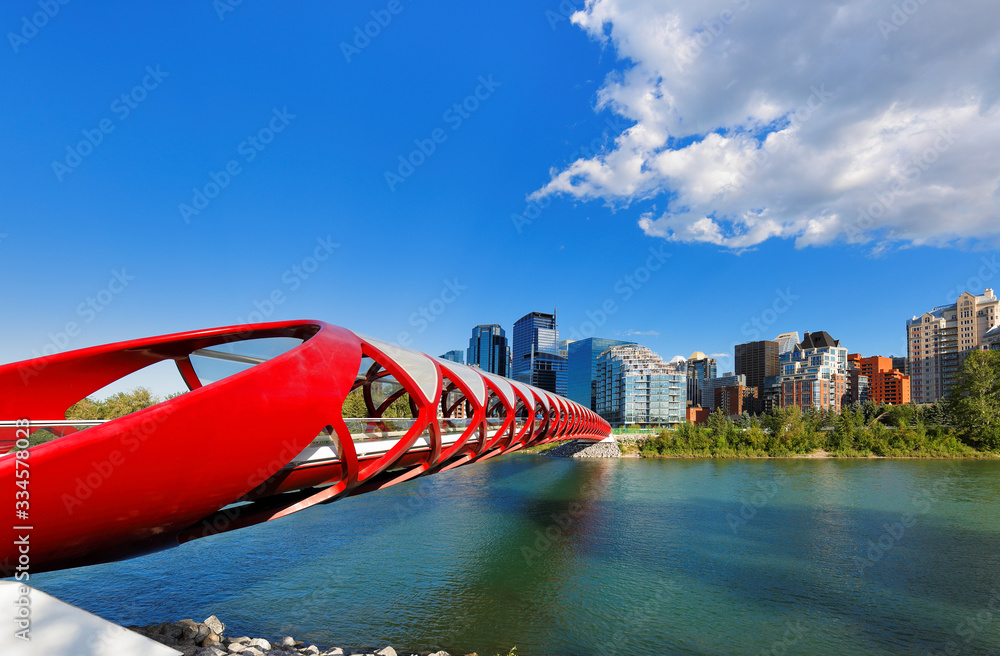 View of Peace Bridge at Calgary AB Canada on a sunny afternoon. Peace Bridge is a pedestrian bridge.