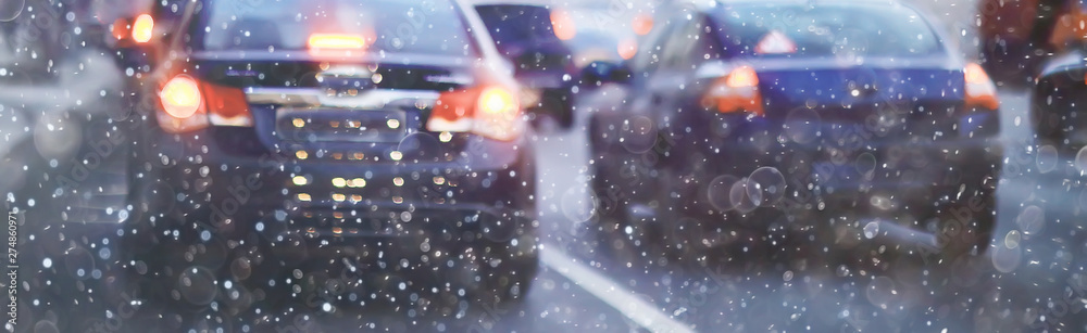 Christmas and Happy new year on blurred bokeh with snowfall banner background