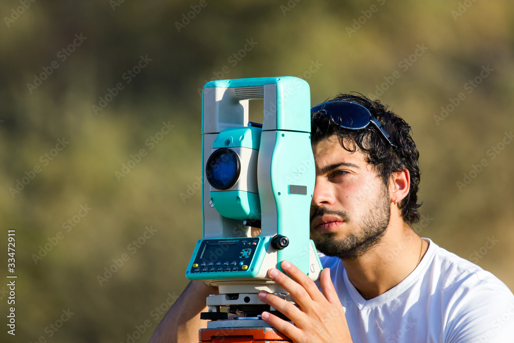 Ragazzo Geometra e Rilievi Topografici in campagna