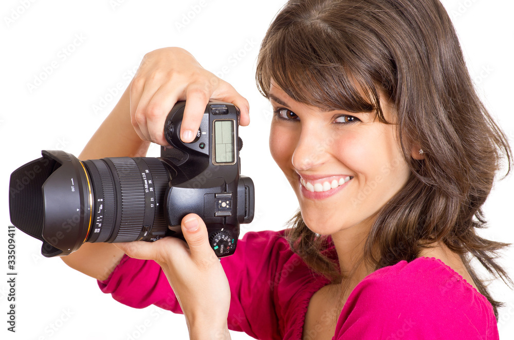 lachende Fotografin mit Kamera