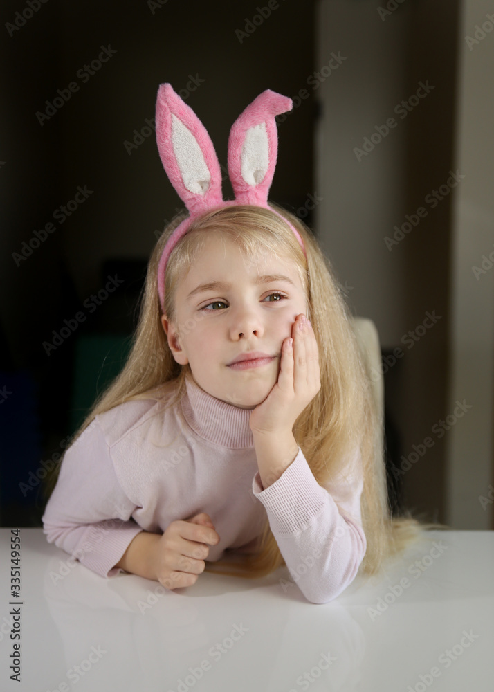 Young blonde child wearing easter bunny ears serious face thinking about question, pensive expression.