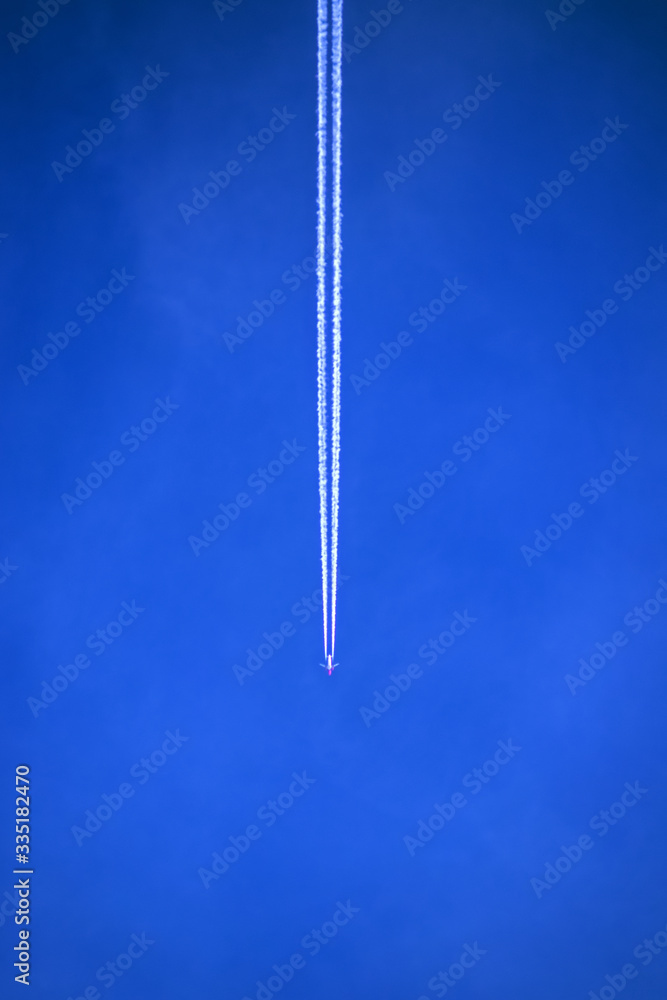 Flugzeug, Maschine mit Kondensstreifen (Homomutatu) mittig von oben nach unten, Freiraum rechts und links