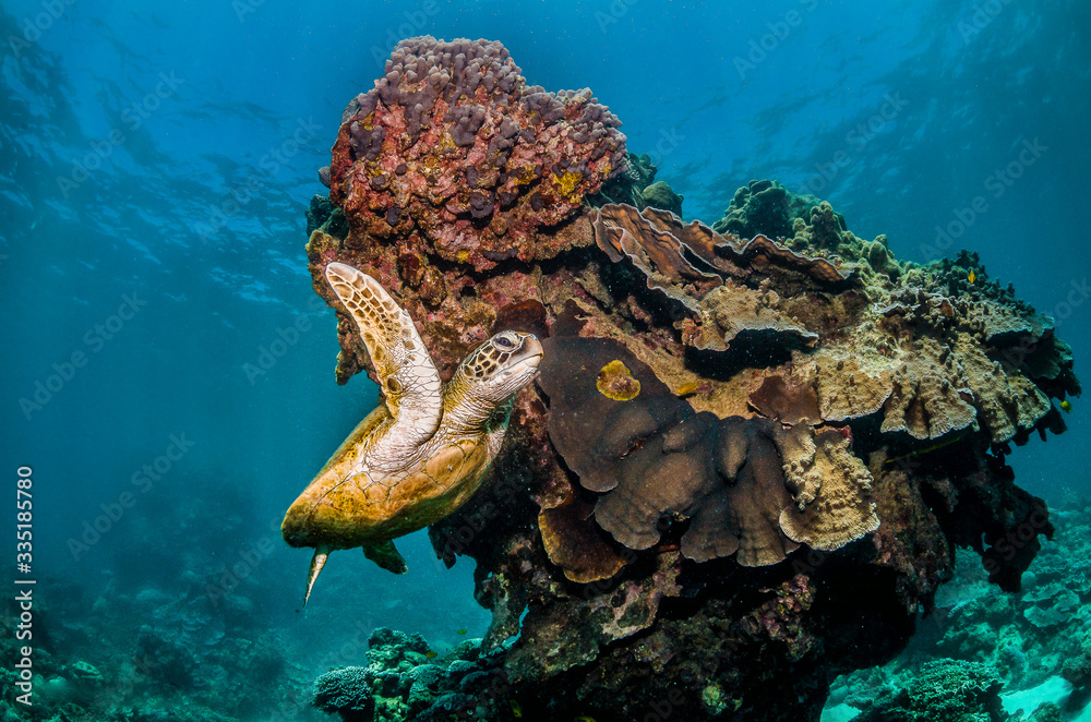 Turtle Swimming in the Wild Among Colorful Coral Reef