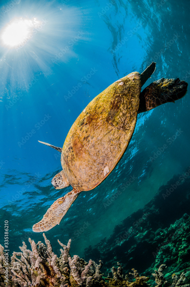 Turtle Swimming in the Wild Among Colorful Coral Reef
