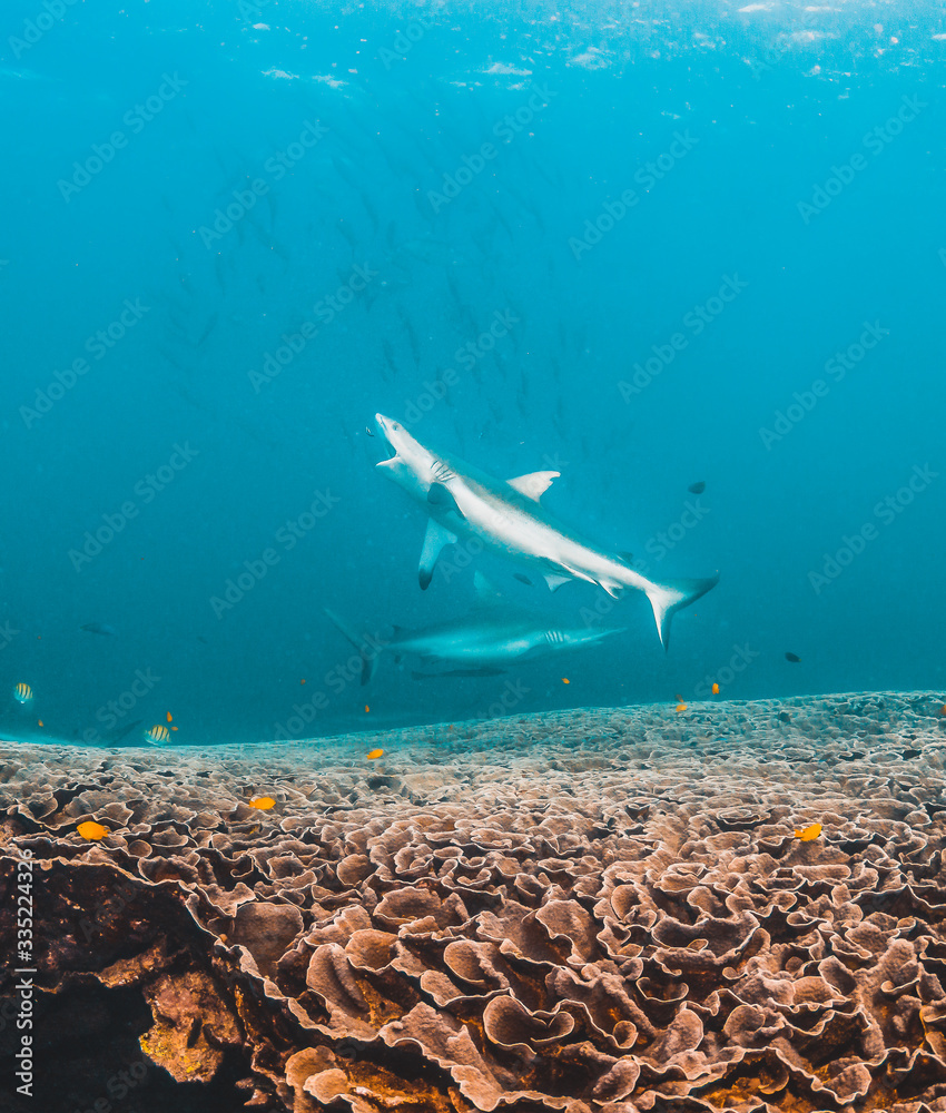 Reef Sharks schooling among colorful coral reef in clear blue ocean