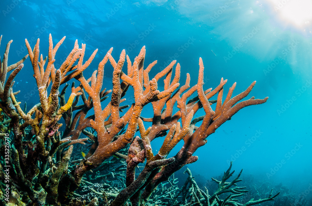 Underwater shot of colorful coral reef in clear blue water