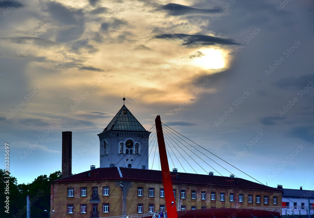 Jelgava, Latvia - Sunset over St.Trinity Church Tower, a bright yellow sun peeking out of gray clouds.
