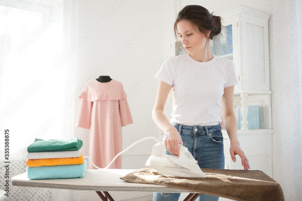 Young Smiling Woman Ironing Clothes On Ironing Board At Home