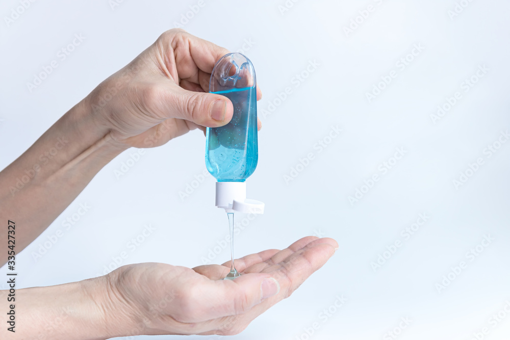 People using bottle of alcohol gel clean hands hygiene prevention of coronavirus virus outbreak.