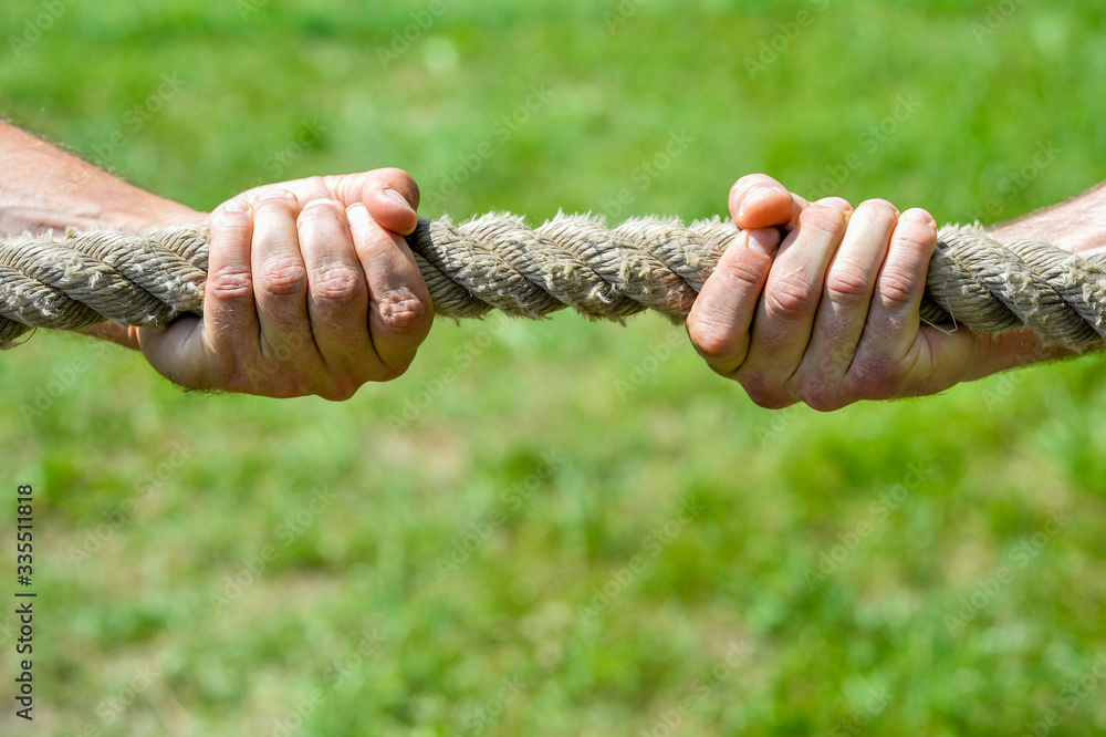Two men's hands pull the rope each in his own direction. The concept of dispute, conflict and force