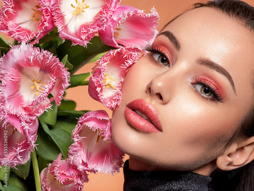 Beautiful white girl with flowers. Stunning brunette girl with big bouquet flowers of pink tulips. Pretty woman with bright makeup