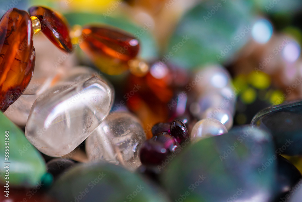 A lot of natural stone jewelry: quartz, rock crystal, amber, pearls, opal, carnelian, garnet, sodalite, agate-texture, background, luxury, fashion concept, close up, macro