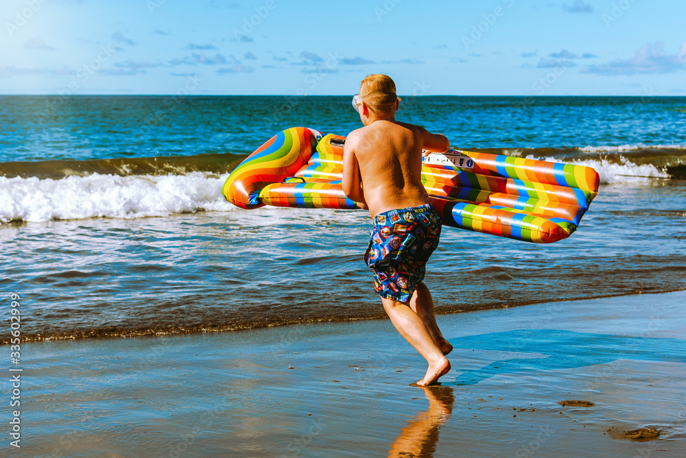 Beach vacation. A boy with an air mattress runs into the sea