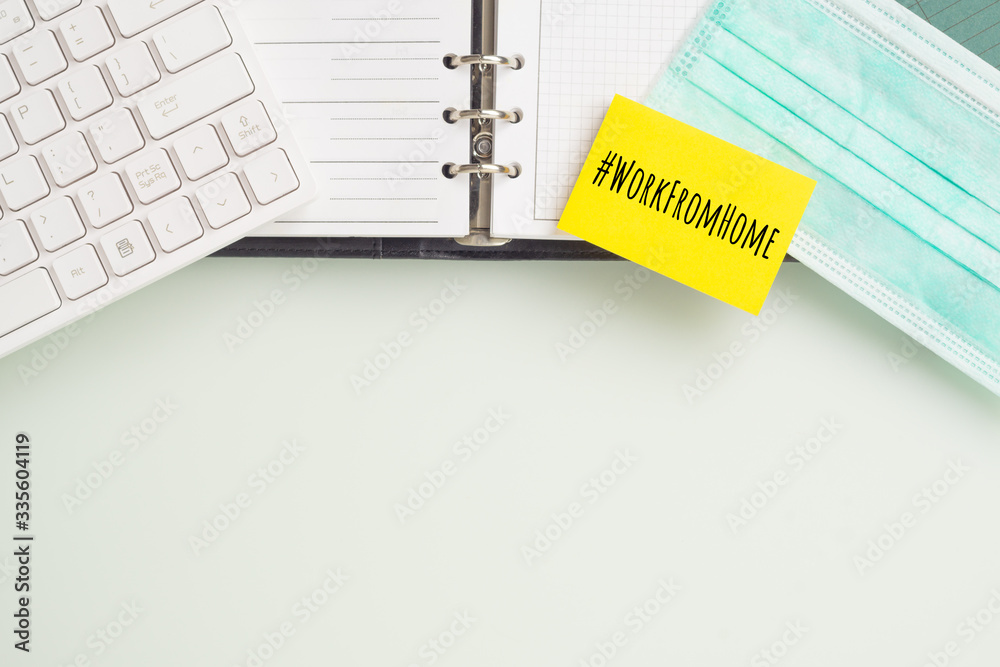 Work from home for quarantine times in Coronavirus Covid-19 pandemic outbreak background concept. Mockup sticky note on home office desk table during virus pandemic. Online Working.