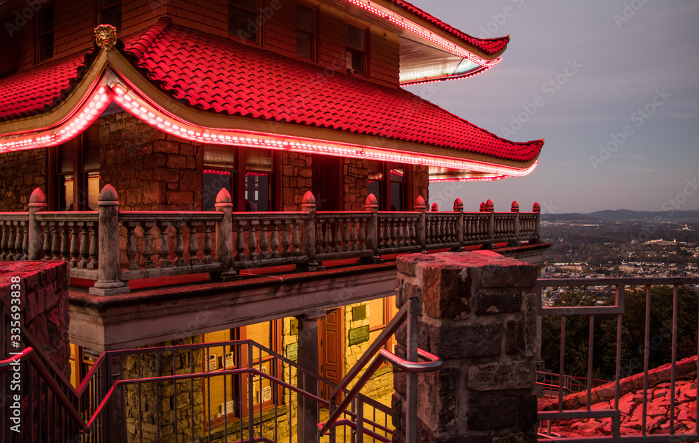 Detail of the entrance and second floor of the Reading Pagoda in the early morning