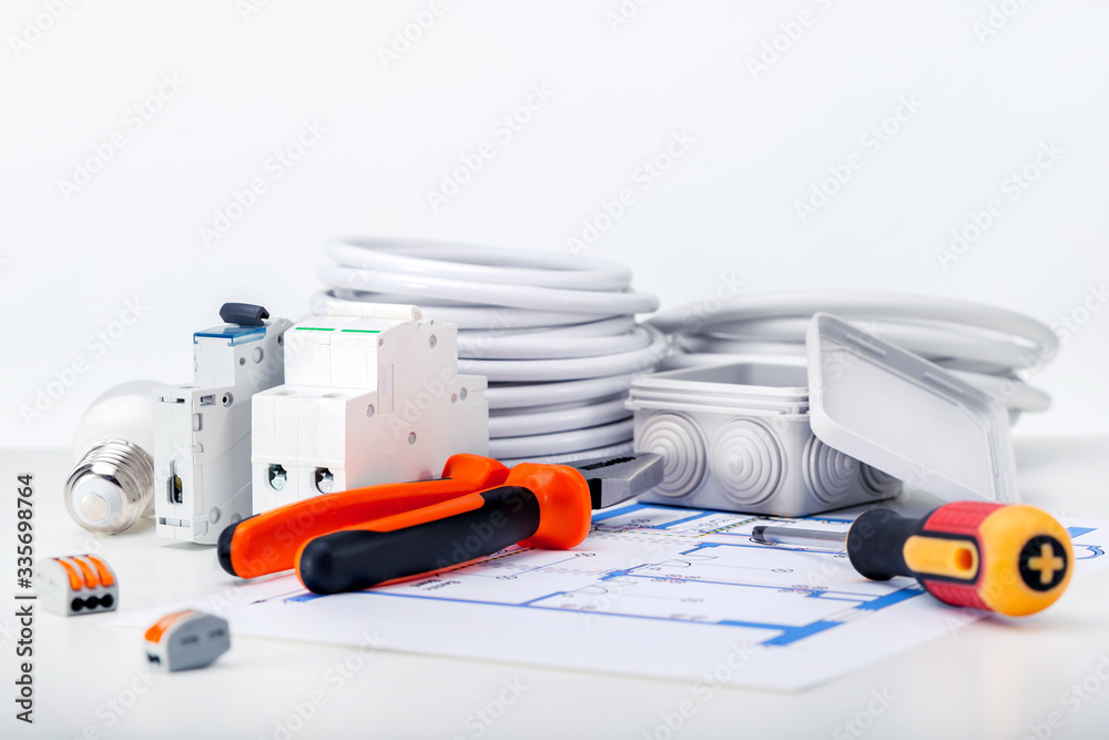 Electric different equipment, wires and tools on Electrical diagram. Components for electricity.