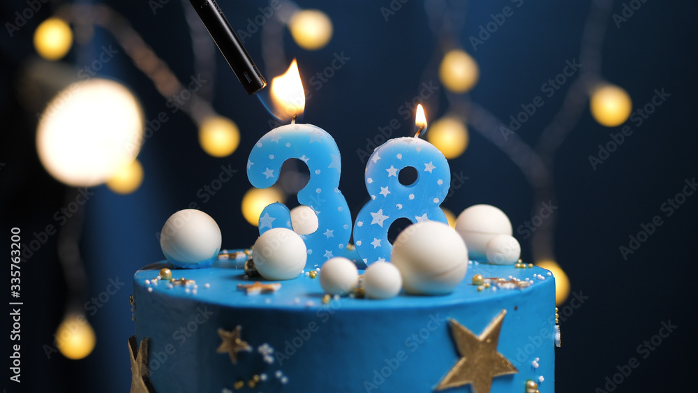 Birthday cake number 38 stars sky and moon concept, blue candle is fire by lighter. Copy space on right side of screen. Close-up